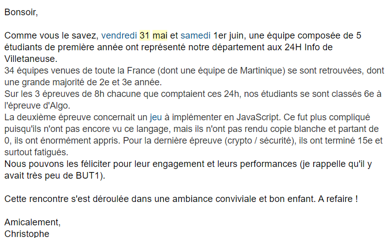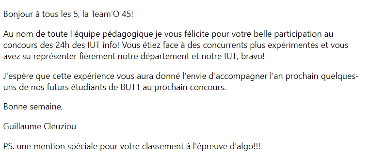 En 2024, j'ai eu la chance de pouvoir représenter l'IUT Informatique d'Orléans aux 24h de l'info, avec mon équipe que j'ai moi-même confectionnée.