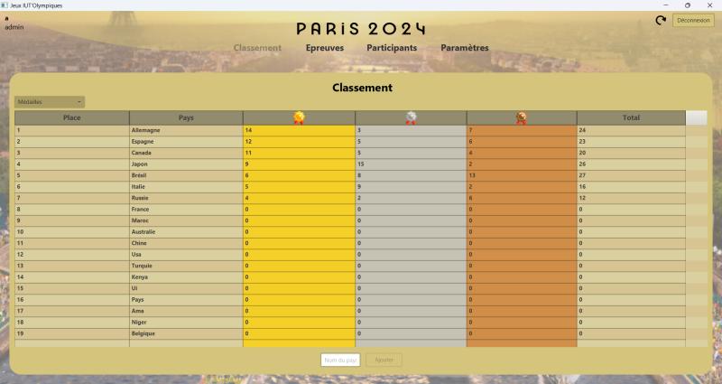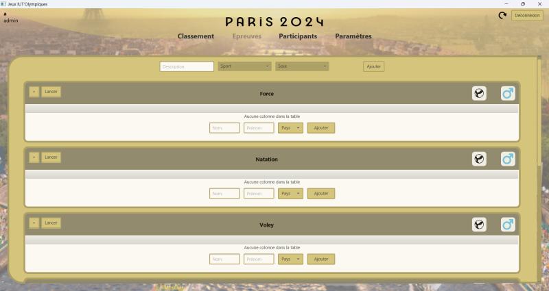 Dans le cadre d’un projet, il nous a été demandé de concevoir une application en JAVA (Suivant le patterne MVC) qui permet de créer des épreuves Olympiques, de générer, de consulter et d’enregistrer des résultats pour chaque épreuve en fonction des équipes ou athlètes de chaque pays.