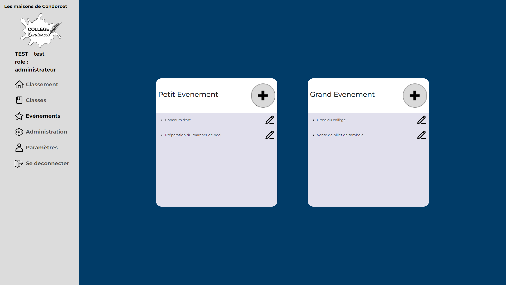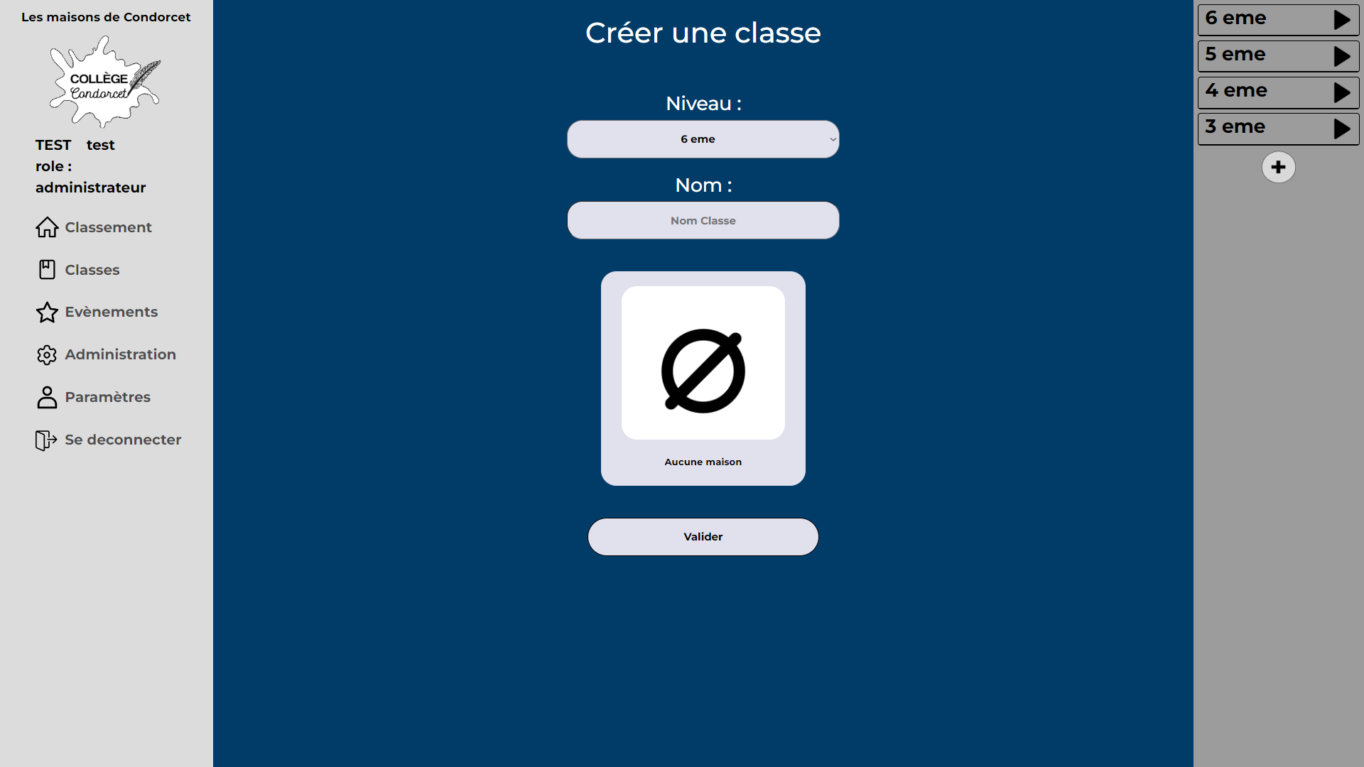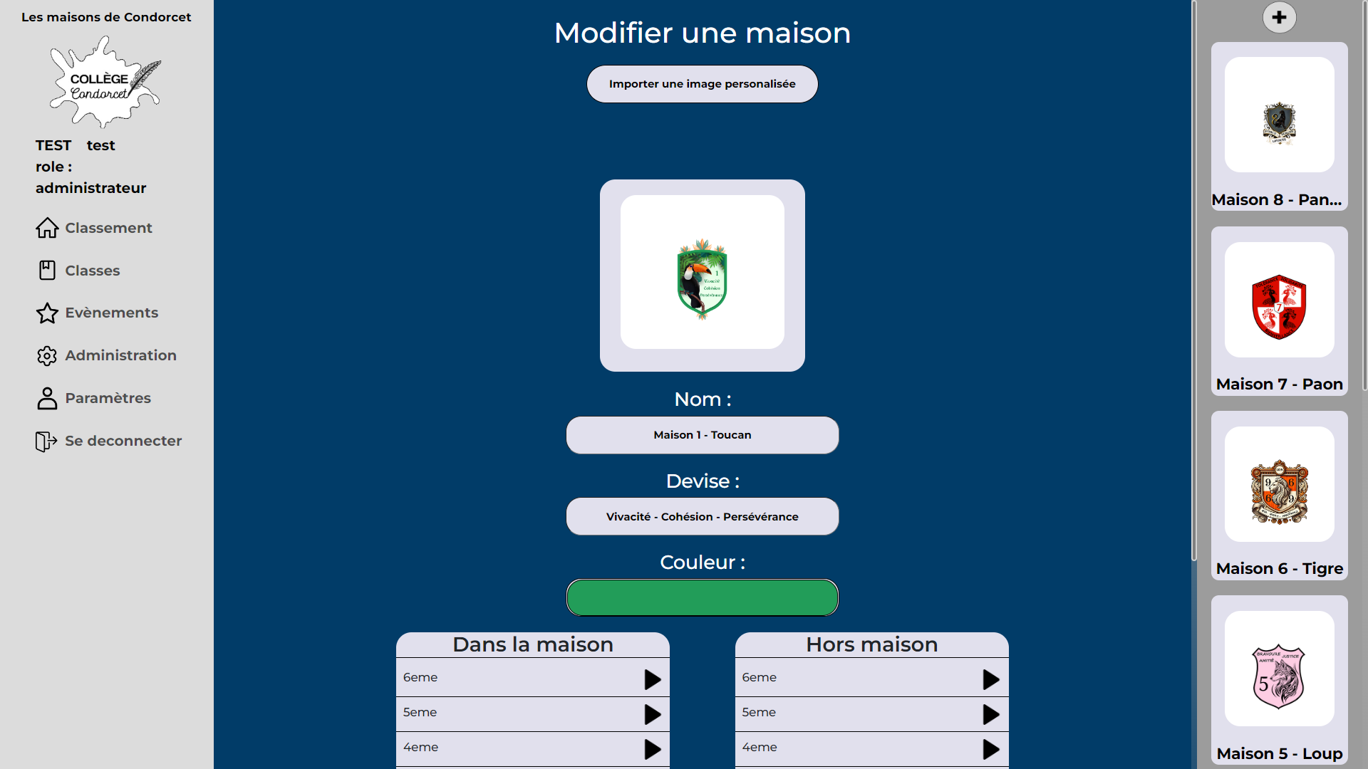 Enfin celui d'administrateur, qui en plus de pouvoir faire ce que les deux rôles précédents peuvent, il peut créer, modifier et supprimer des maisons, des classes, des utilisateurs, actions et événements.