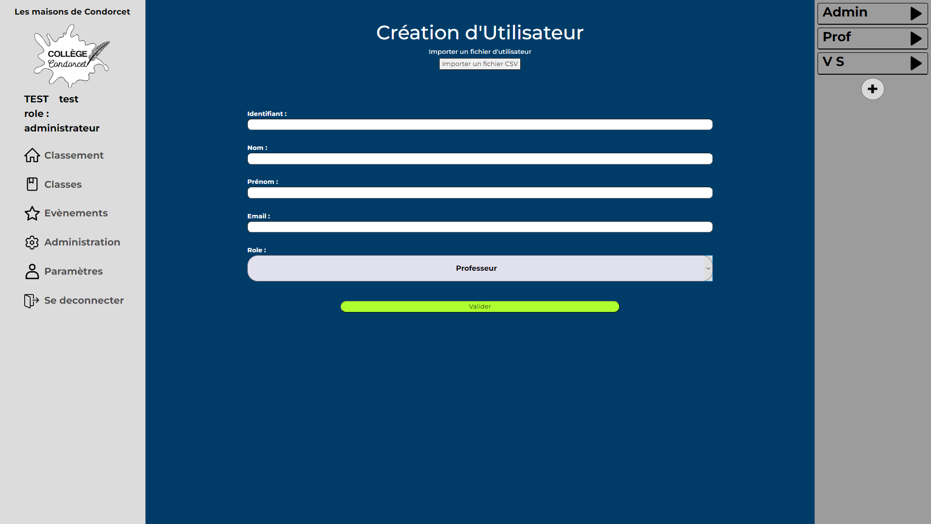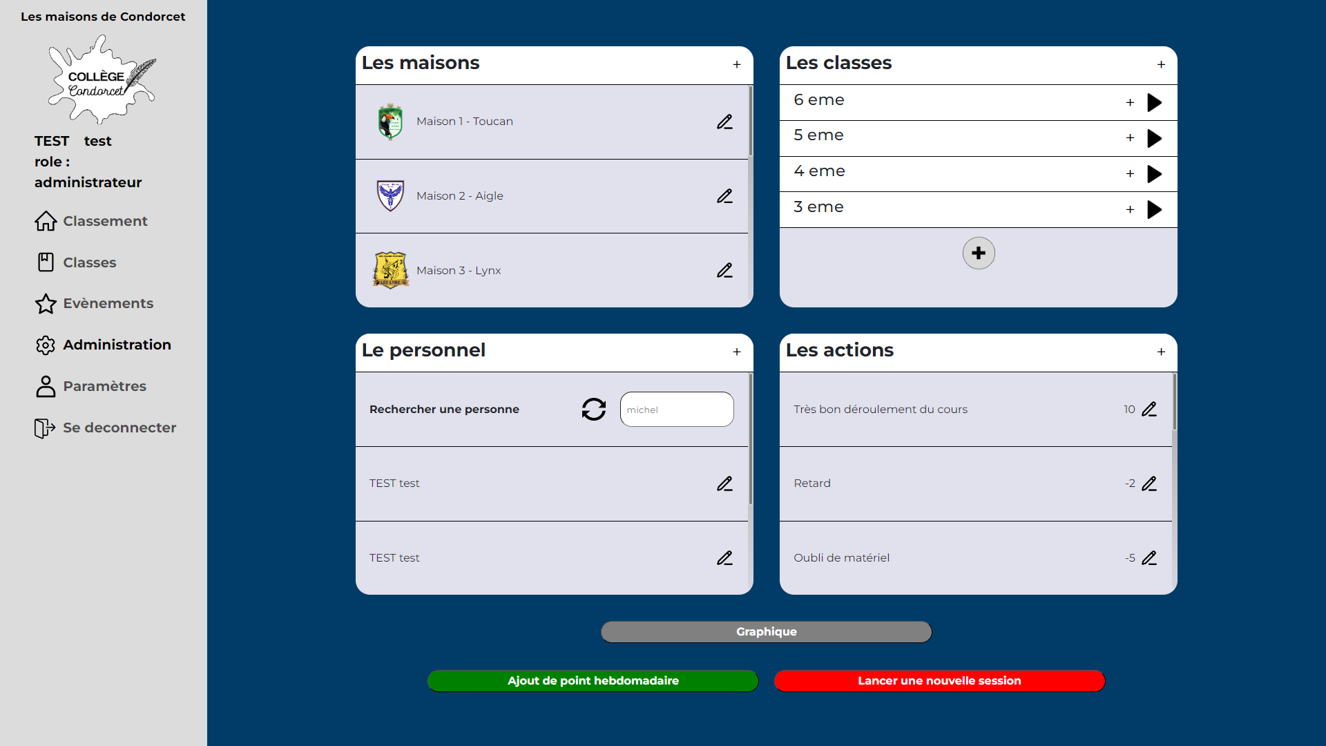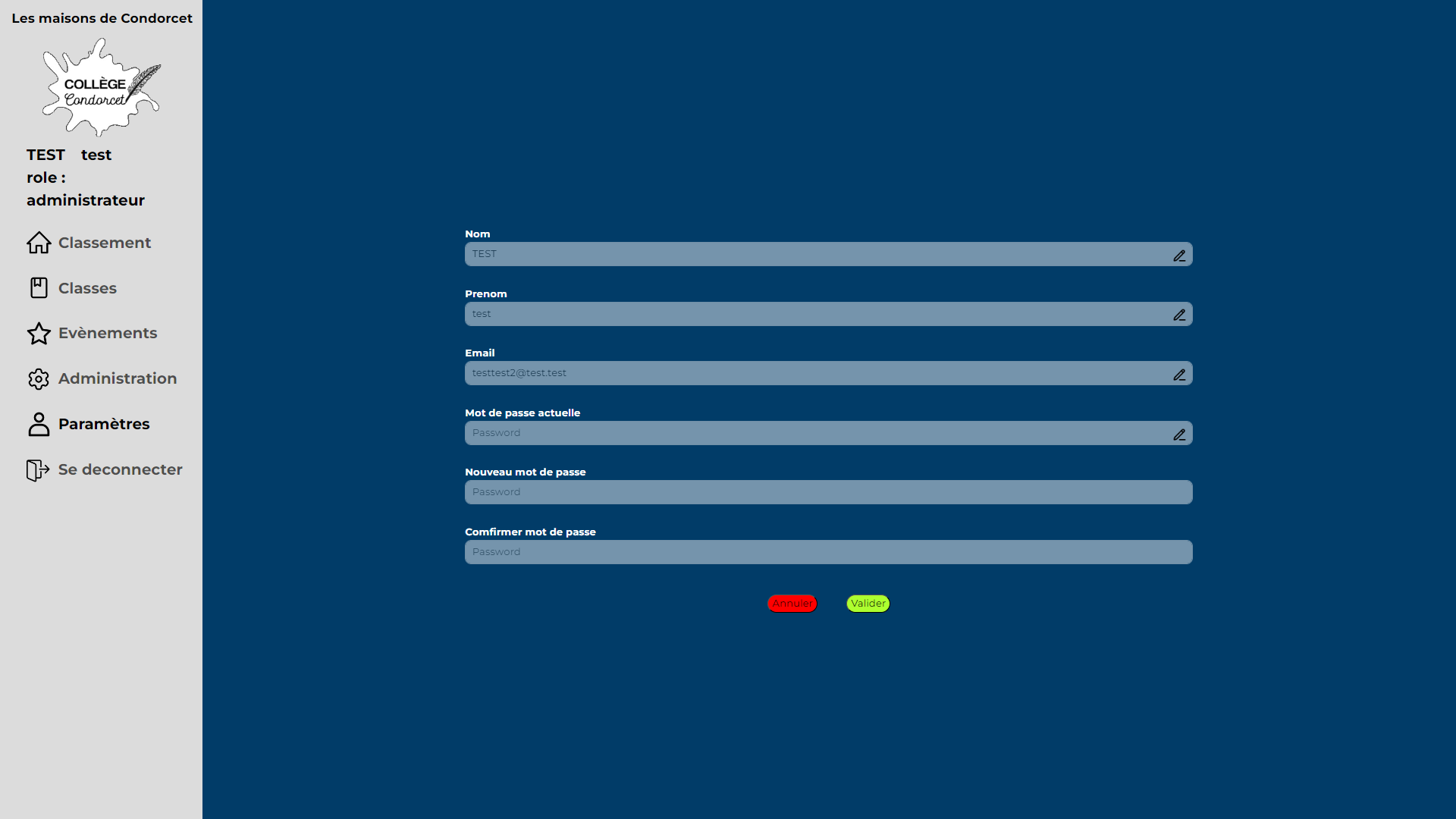 Enfin celui d'administrateur, qui en plus de pouvoir faire ce que les deux rôles précédents peuvent, il peut créer, modifier et supprimer des maisons, des classes, des utilisateurs, actions et événements.