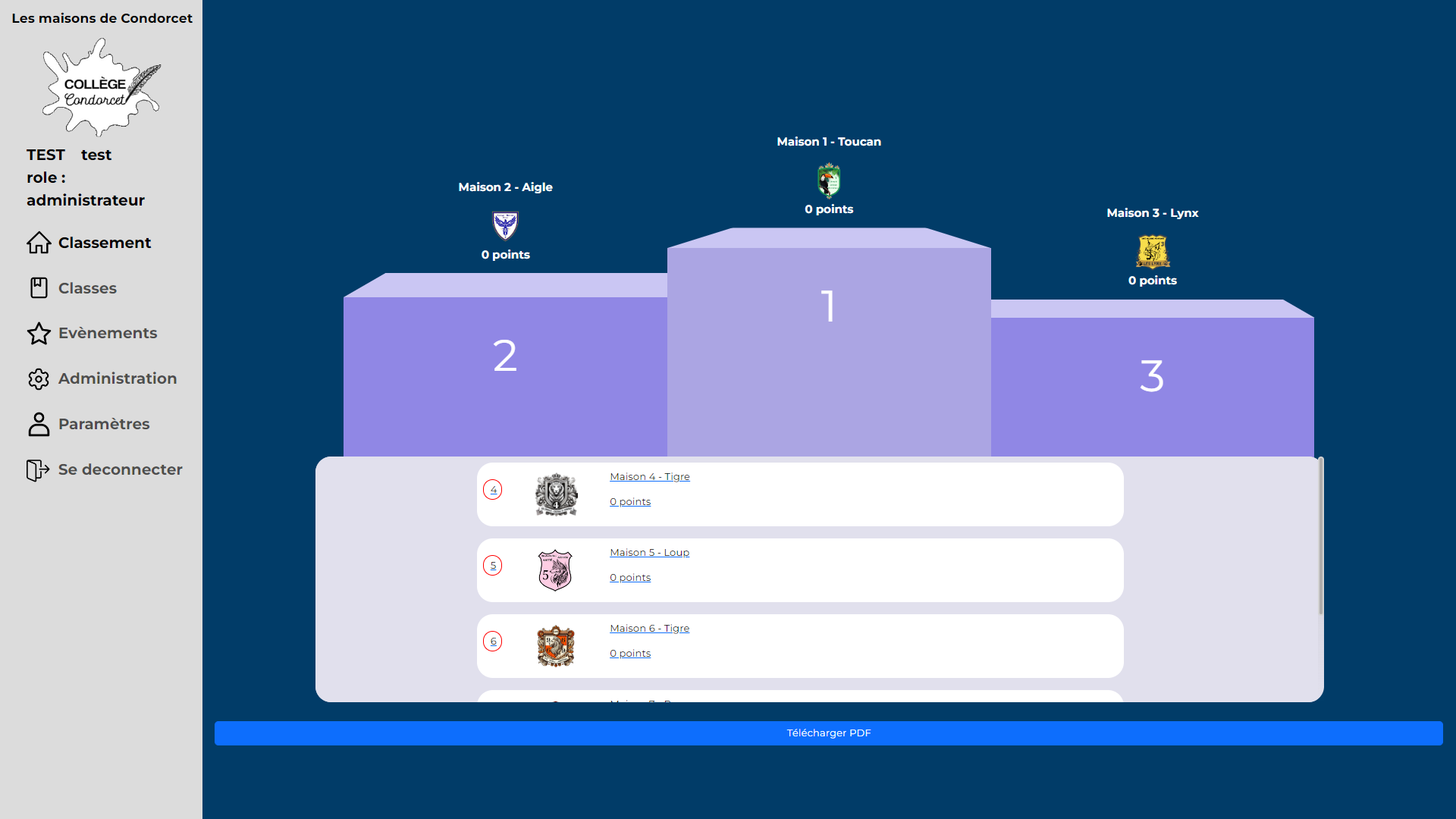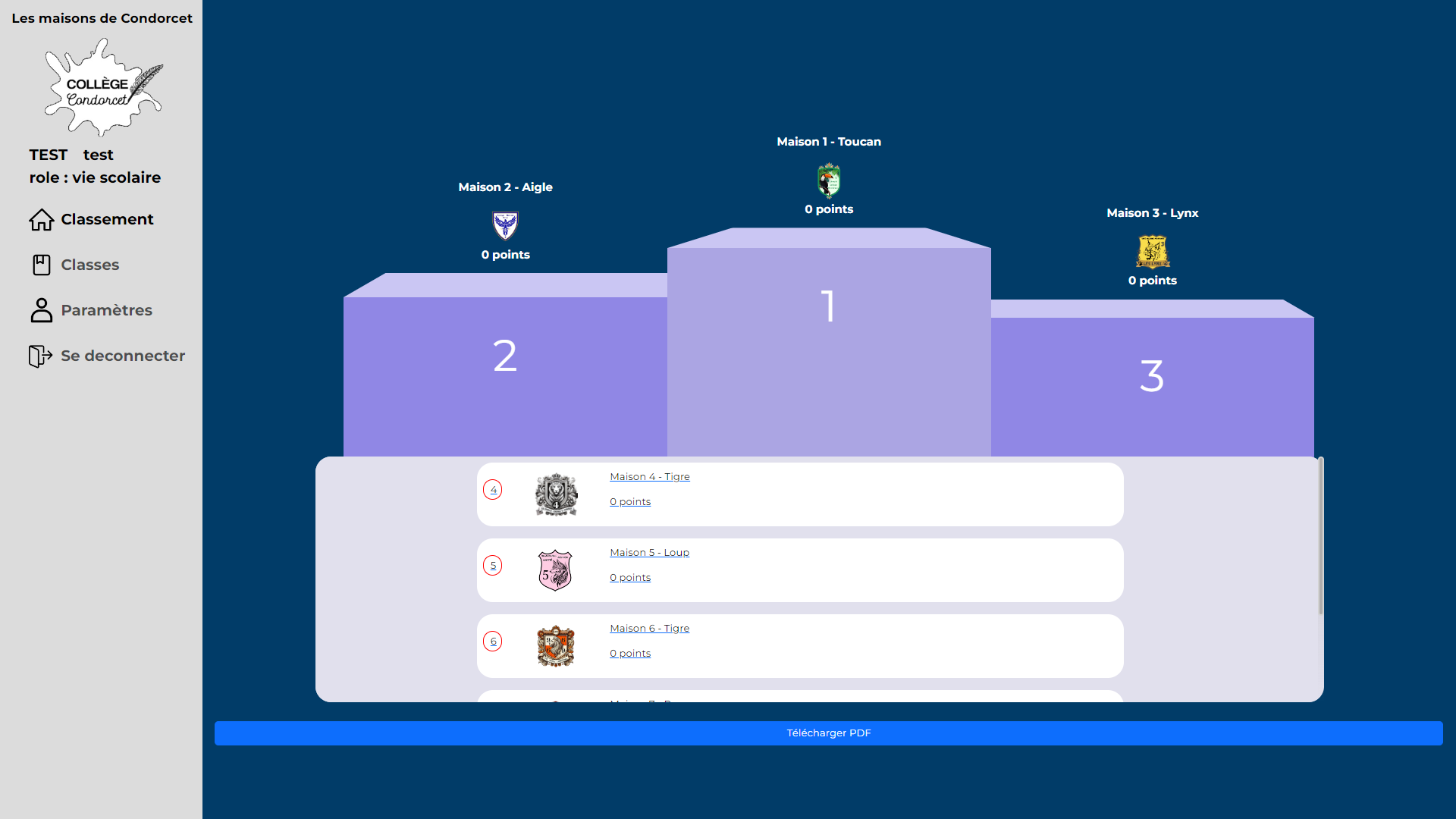 En plus de cela, il pourra voir des statistiques sur les connexions et points attribués des utilisateurs, réinitialiser la session (réinitialiser les points de chaque maison et chaque classe et enregistrer le classement final).